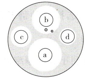 [例1] A、B、C、D 4种抗生素均可用于治疗金黄色葡萄球菌(Sau)引起的肺炎。为选出具有最佳疗效的抗生素,科研人员分别将含等剂量A、B、C、D 4种抗生素的4张大小相同的滤纸片a、b、c、d置于Sau均匀分布的固体培养基上,在适宜条件下培养48 h,结果如图所示。下列相关叙述错误的是 (