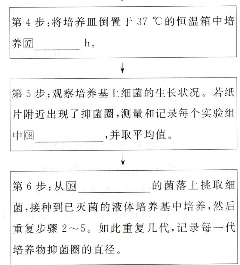 3. 实验结果:与区域①相比,区域②③④纸片周围会出现抑菌圈;②③④区域抑菌圈的平均直径逐代越来越ⓀⓊ10________。