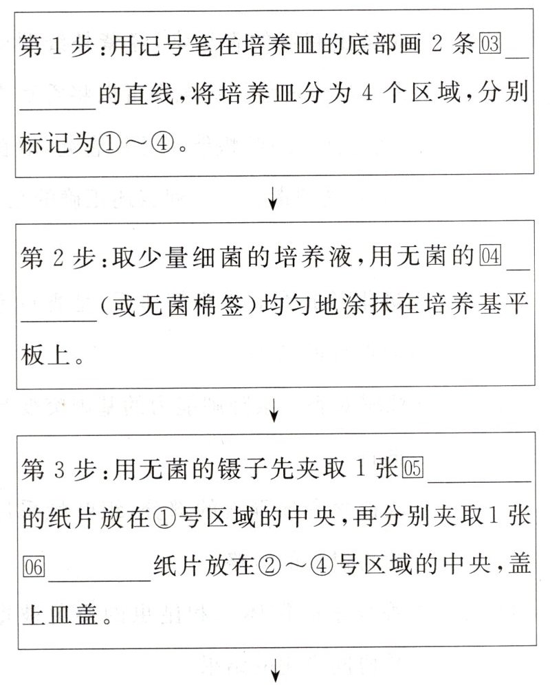 1必备知识 01耐药性 02耐药菌 03相互垂直 04涂布器 05不含抗生素 06抗生素 0712~16 08抑菌圈的直径 09抑菌圈边缘 10小