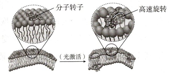 [例 1] 最新研究表明,由光驱动的分子转子能识别特定的细胞,并在细胞膜上钻孔,通过钻的孔将某些药物运送到这些细胞中,其他物质不能随意进入。如图为钻孔过程的示意图,下列有关说法错误的是(