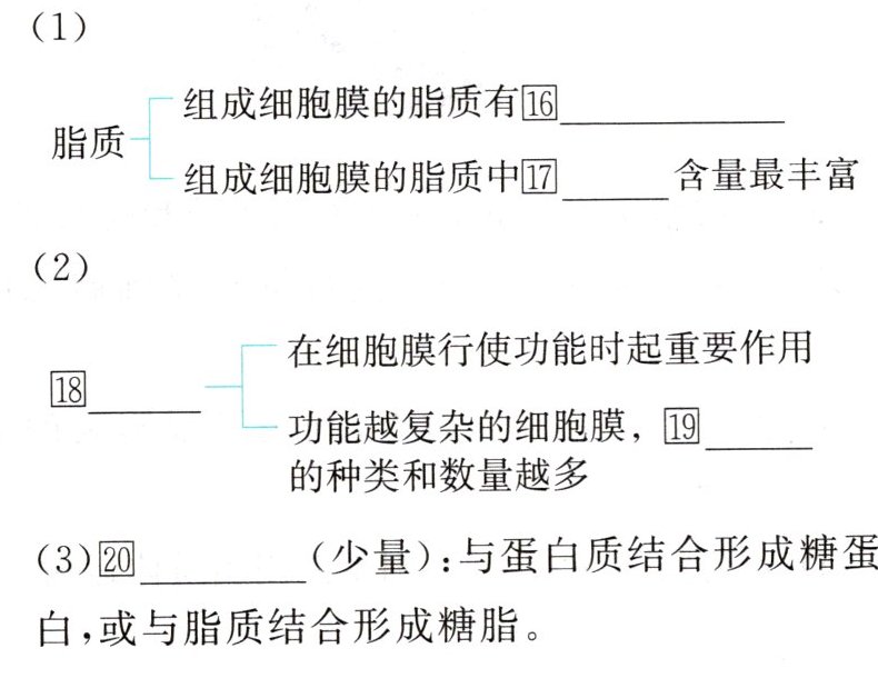 16磷脂和胆固醇 17磷脂 18蛋白质 19蛋白质 20糖类