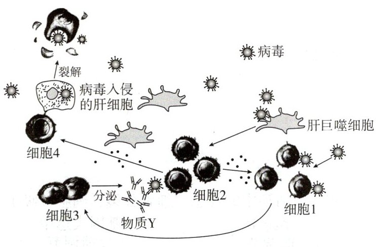 1.C [肝巨噬细胞能够吞噬病原体,也可以呈递抗原,所以既能参与非特异性免疫,也能参与特异性免疫,A正确;细胞2是辅助性T细胞,在细胞免疫过程中可以促进细胞4(细胞毒性T细胞)的活化,在体液免疫过程中可以促进细胞1(B细胞)的活化,B正确;细胞3分泌的物质Y是抗体,抗体与抗原结合形成沉淀或细胞集团,不能将病毒清除,细胞4(细胞毒性T细胞)可裂解靶细胞,使抗原被释放,但是不能直接清除内环境中的病毒,需要吞噬细胞的吞噬和消化才能清除,C错误;病毒在人体内被清除后,活化的细胞毒性T细胞的功能将受到抑制,机体将逐渐恢复到正常状态,D正确。]
