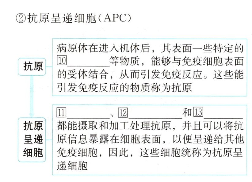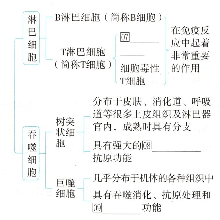 1必备知识 ①T细胞 ②新的血细胞 ③衰老的血细胞 ④淋巴细胞 ⑤侵入体内的微生物 ⑥防御 ⑦辅助性T细胞 ⑧吞噬、呈递 ⑨呈递 ⑩蛋白质 ⑪B细胞 ⑫树突状细胞 ⑬巨噬细胞 ⑭免疫细胞或其他 ⑮浆 ⑯蛋白质