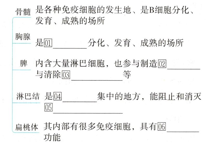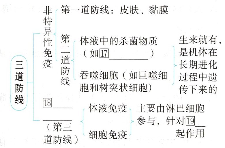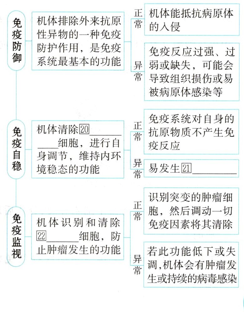 1必备知识 ⑰溶菌酶 ⑱特异性免疫 ⑲特定的抗原 ⑳衰老或损伤的 ㉑自身免疫病 ㉒突变的