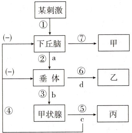 [例 3] 如图为人体稳态调节的部分示意图,其中数字①~⑦表示过程,字母 a~d 表示激素,甲~丙表示器官、结构或细胞。请据图回答下列问题: