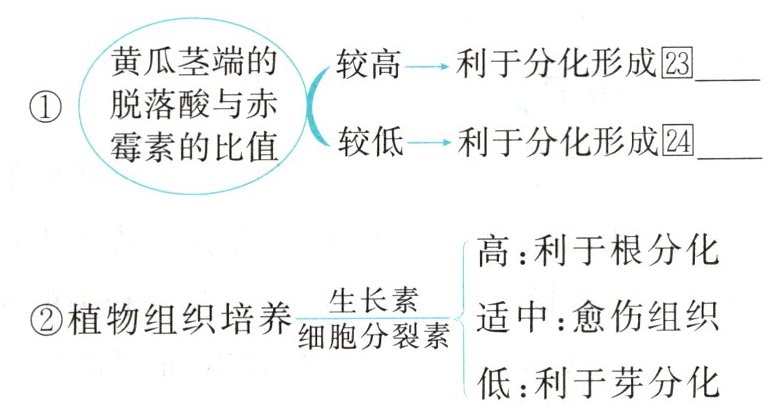 ① 黄瓜茎端的脱落酸与赤霉素的比值:较高→利于分化形成\underline{㉓};较低→利于分化形成\underline{㉔}