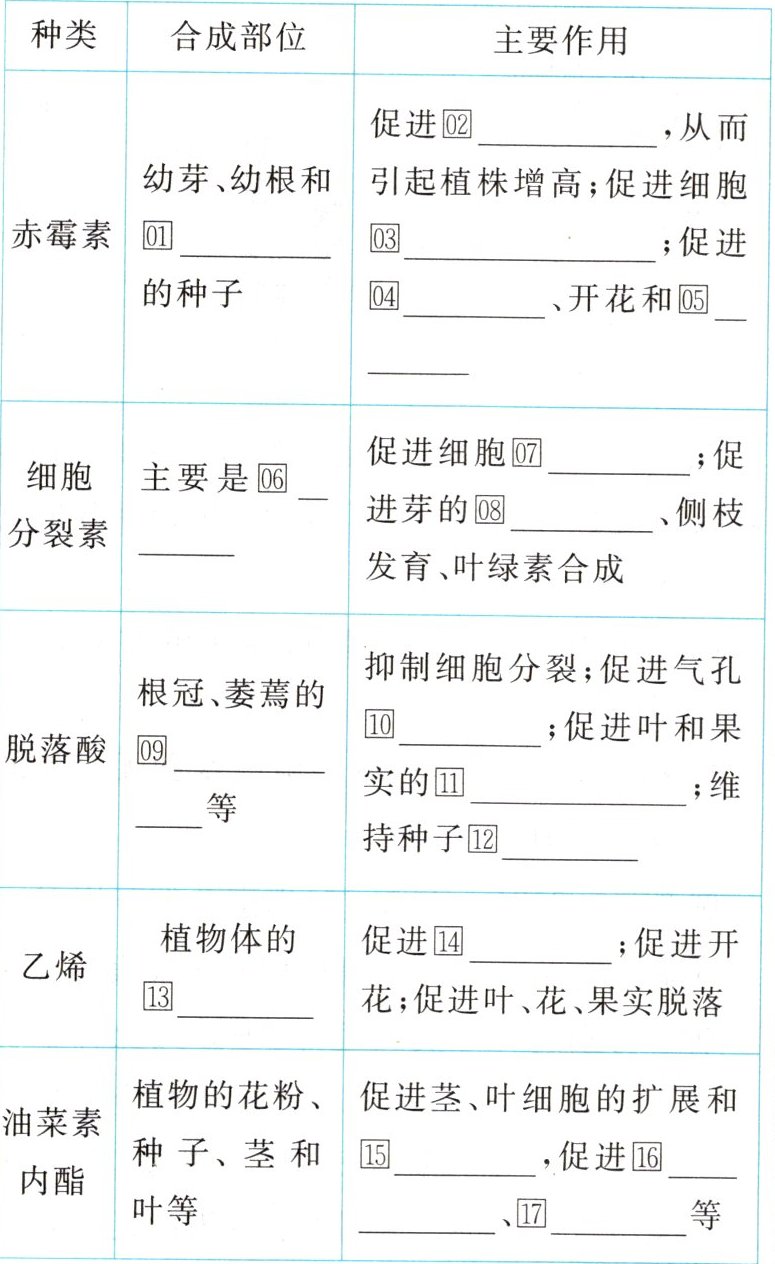 1. 其他植物激素的种类和作用:未成熟 细胞伸长 分裂与分化 种子萌发 果实发育 根尖 分裂 分化 叶片 关闭 衰老和脱落 休眠 各个部位 果实成熟 分裂 花粉管生长 种子萌发
