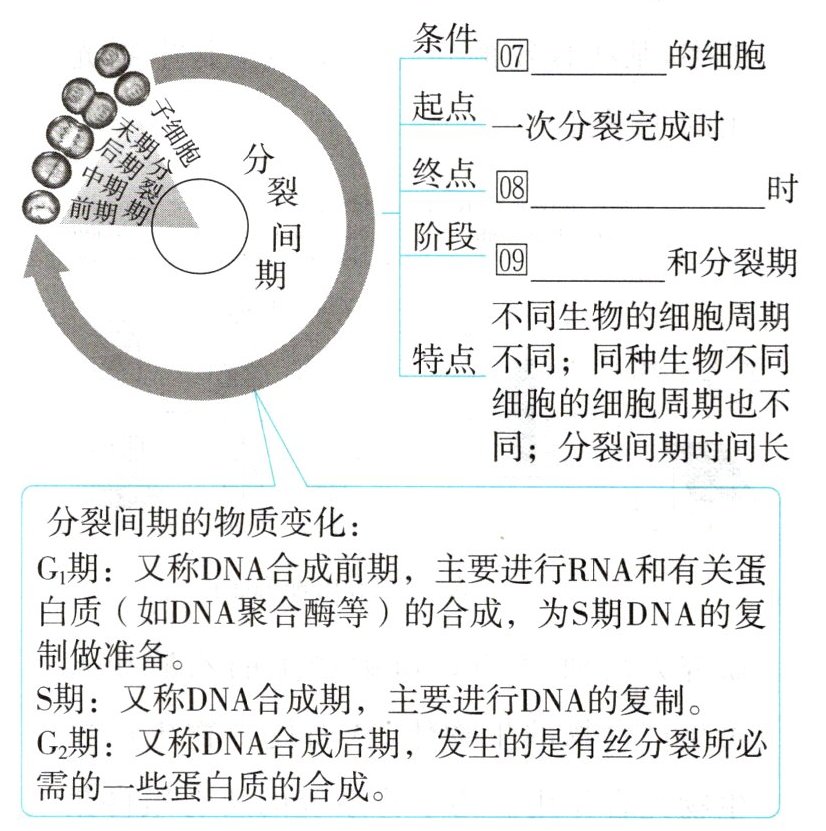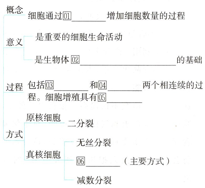 01细胞分裂 02生长、发育、繁殖和遗传 03物质准备 04细胞分裂 05周期性 06有丝分裂