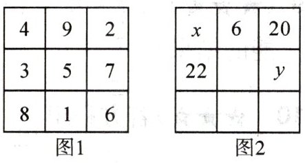幻方是古老的数学问题,我国古代的《洛书》中记载了最早的幻方——九宫格. 将 9 个数填入幻方的空格中,要求每一横行、每一竖列以及两条对角线上的 3 个数之和相等,例如图 1 就是一个幻方,图 2 是一个未完成的幻方,你知道 $ x $ 与 $ y $ 的和吗?
