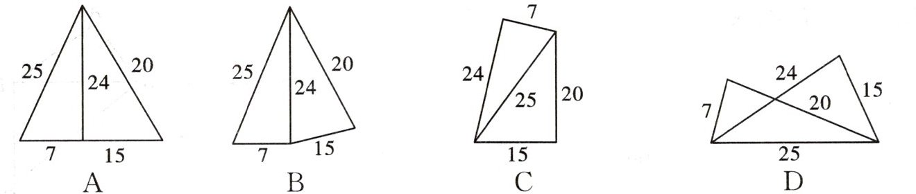 2. (★★)五根小木棒,其长度分别为7,15,20,24,25,现将它们摆成两个直角三角形,如图,其中正确的是 ()