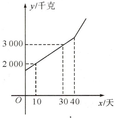 21. (★★★★)某块试验田里的农作物每天的需水量$y$(千克)与生长时间$x$(天)之间的关系如图所示,这些农作物在第$10$天、第$30天的需水量分别为2000$千克、$3000$千克,在第$40天后每一天的需水量比前一天增加100$千克。