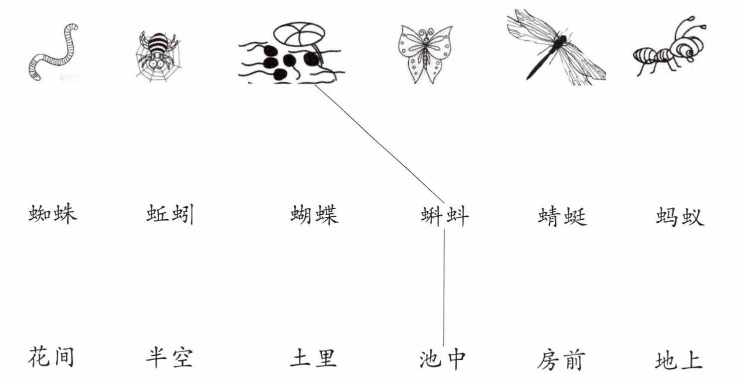 蜘蛛——房前;蚯蚓——土里;蝴蝶——花间;蜻蜓——半空;蚂蚁——地上。