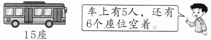 【解析】:已知车一共有$15$个座位,空着$6$个座位,求车上现有人数,用座位总数减去空座位数,即$15 - 6 = 9$(人)。