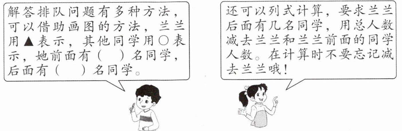 - 算一算:通过观察可知她前面有$3$名同学,后面同学的人数为$11 - 3 - 1=7$(名)