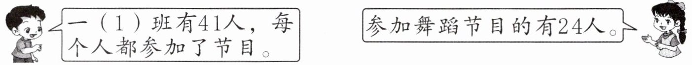 【解析】:已知一(1)班总人数是$41$人,这是参加两个节目(舞蹈和诗朗诵)的总人数。又知道参加舞蹈节目的有$24$人,因为每人只能参加一个节目,那么从总人数里去掉参加舞蹈节目的人数,剩下的就是参加诗朗诵的人数,用减法计算,即$41 - 24 = 17$(人)。