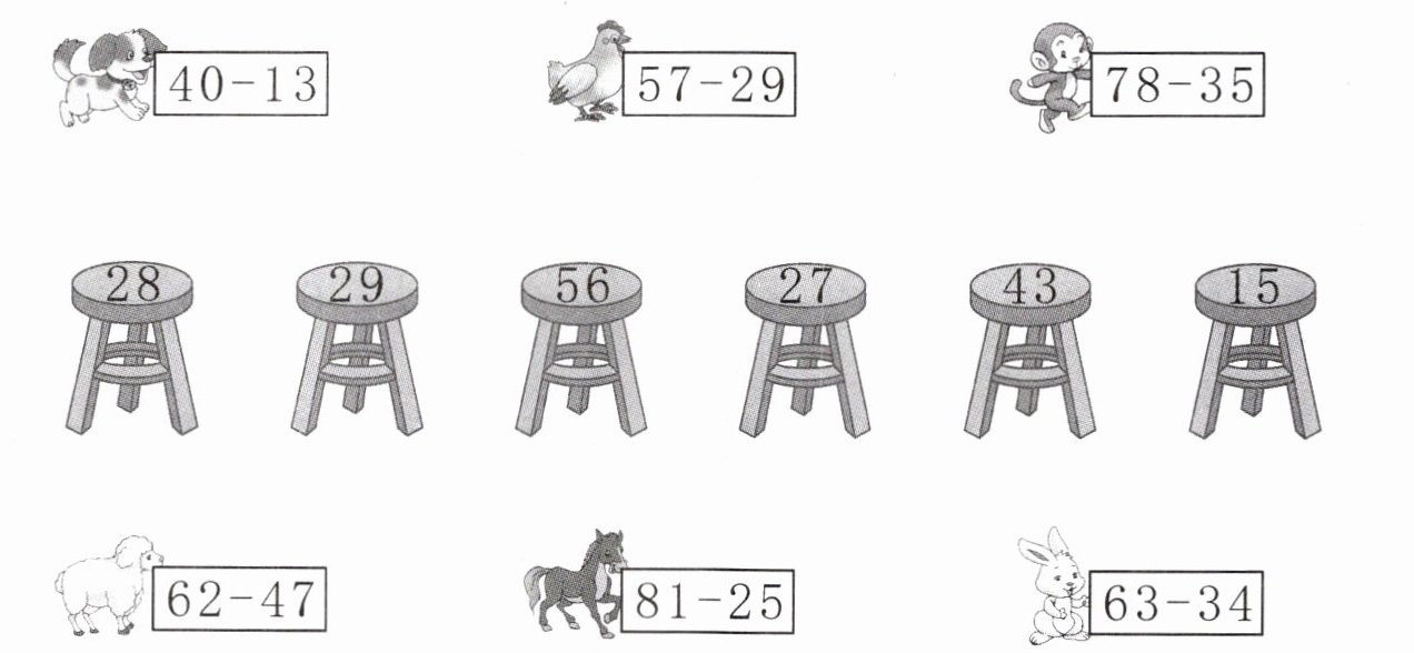 【答案】:小狗($40 - 13$)连$27$;小鸡($57 - 29$)连$28$;小猴($78 - 35$)连$43$;小羊($62 - 47$)连$15$;小马($81 - 25$)连$56$;小兔($63 - 34$)连$29$。