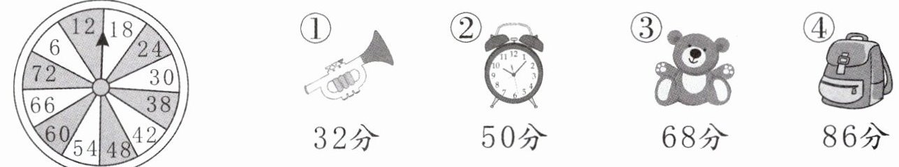 (1) 莉莉转到48和30,兰兰转到18和54,两人中得分更高的是( ),她能兑换的礼品是( )(填序号)。