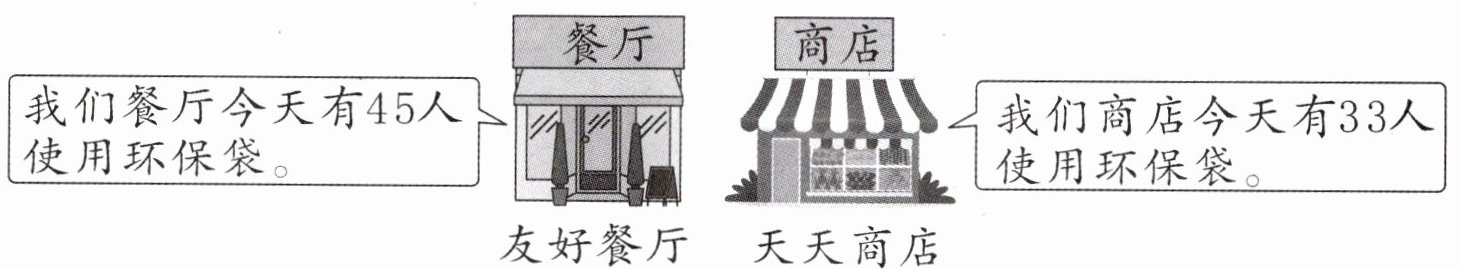 (1)求友好餐厅和天天商店今天一共使用环保袋的人数,是把两个数合并成一个数,用加法解决。