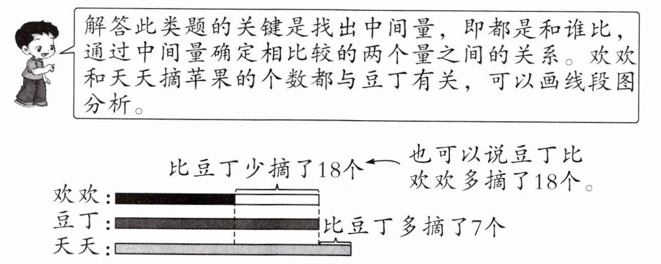 【解析】:求欢欢比天天少摘了多少个,也就是求天天比欢欢多摘了多少个,要把豆丁比欢欢多摘的(18)个与天天比豆丁多摘的(7)个合起来,用(加)法计算,列式是(18)$\bigcirc$(7)=(25)(个),这里的$\bigcirc$应填“+”。