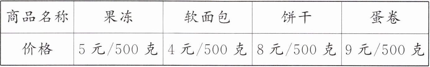 (1)2千克是4个500克 1千克是2个500克 软面包:$4×4=16$(元) 蛋卷:$2×9=18$(元) $16+18=34$(元)