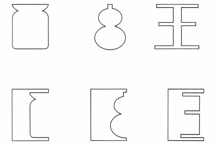 【解析】:根据轴对称图形的特征,对折后能完全重合。观察第一行图案的形状特征,与第二行对折后的纸进行匹配。第一个图案有类似瓶口和瓶身的形状,与第二行第二个对折纸(有类似曲线部分)匹配;第二个图案是葫芦形状(曲线对称),与第二行第一个对折纸(有曲线部分)匹配;第三个图案是类似“王”字(直线对称),与第二行第三个对折纸(直线部分对称)匹配。