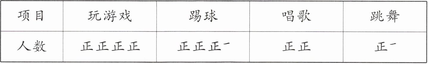 下表是王老师统计的二(1)班全体同学的兴趣爱好情况。(每人只选最喜欢的一个项目)
