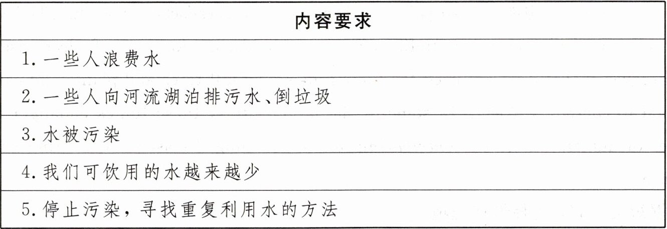 参考词汇:浪费水(waste water),排污水(pour dirty water),倒垃圾(throw rubbish),被污染(be polluted),越来越少(less and less),保护水资源(protect water resources),重复利用(reuse)