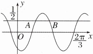 (2)(2023·新高考Ⅱ卷)已知函数 $ f(x) = \sin(\omega x + \varphi) $,如图,$ A,B $ 是直线 $ y = \frac{1}{2} $ 与曲线 $ y = f(x) $ 的两个交点,若 $ |AB| = \frac{\pi}{6} $,则 $ f(\pi) =$
