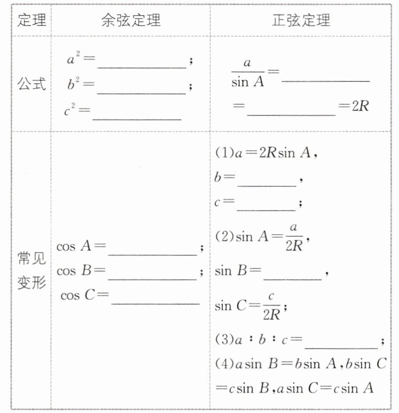 1.$b^{2}+c^{2}-2bc\cos A$ $c^{2}+a^{2}-2ca\cos B$ $\frac{a^{2}+b^{2}-2ab\cos C}{2ac}$ $\frac{b}{\sin B}$ $\frac{c}{\sin C}$ $\frac{b^{2}+c^{2}-a^{2}}{2bc}$ $c^{2}+a^{2}-b^{2}$ $\frac{a^{2}+b^{2}-c^{2}}{2ab}$ $\frac{2R\sin B}{2R\sin C}$ $\frac{b}{2R}$ $\frac{\sin A}{\sin B}$ $\frac{\sin C}{\sin C}$