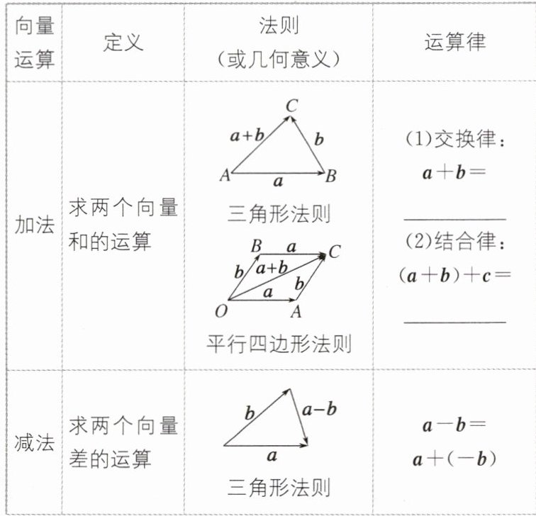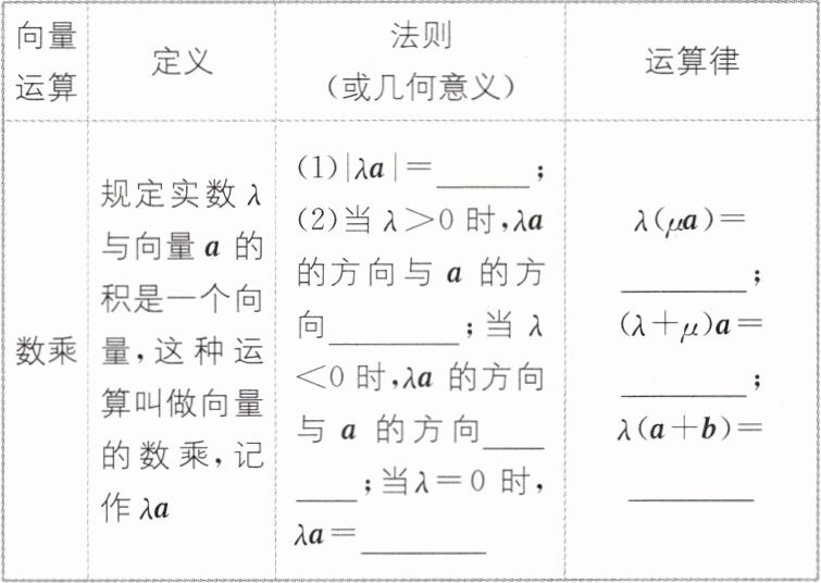 2.$\bm{b}+\bm{a} \ \bm{a}+(\bm{b}+\bm{c})$ $\mid\lambda\mid\mid\bm{a}\mid$ 相同 相反 0 $\lambda\mu\bm{a}$ $\lambda\bm{a}+\mu\bm{a}$ $\lambda\bm{a}+\lambda\bm{b}$