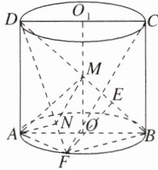(2025·石家庄模拟)如图,在圆柱 $ O_1O $ 中,轴截面 $ ABCD $ 为正方形,点 $ F $ 是 $ \overgroup{AB} $ 上一点,$ M $ 为 $ BD $ 与轴 $ O_1O $ 的交点,$ E $ 为 $ MB $ 的中点,$ N $ 为 $ A $ 在 $ DF $ 上的射影,且 $ EF // $ 平面 $ AMN $,则下列选项正确的有 (