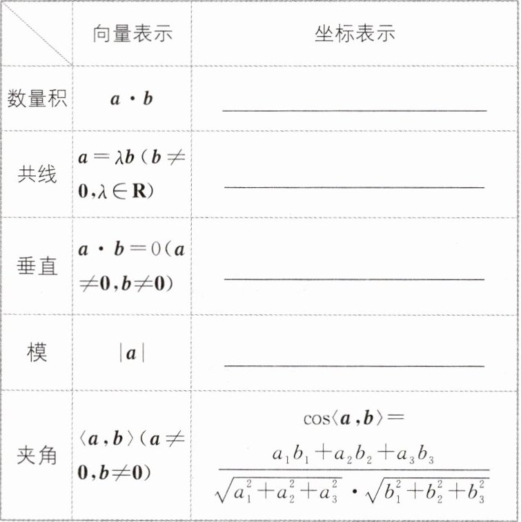 (2)两向量的数量积:已知两个非零向量 $a,b$,则 $|a||b|\cos\langle a,b\rangle$ 叫做 $a,b$ 的数量积,记作 $a\cdot b$,即 $a\cdot b=$