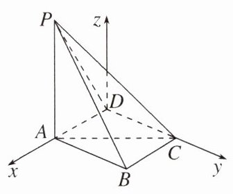 以 $ D $ 为坐标原点, $ AD $ 所在直线为 $ x $ 轴, $ DC $ 所在直线为 $ y $ 轴, 过点 $ D $ 且平行于 $ AP $ 的直线为 $ z $ 轴建立如图所示的空间直角坐标系, 建系