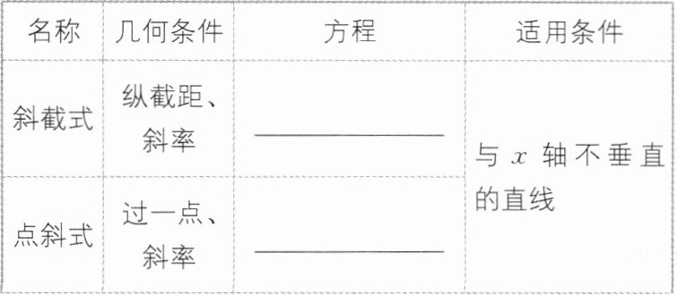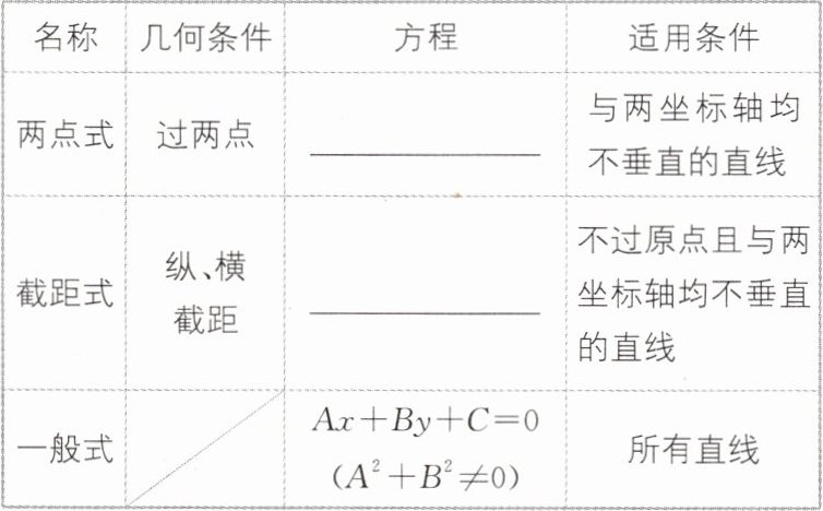 4.$y=kx+b$ $y - y_{0}=k(x - x_{0})$ $\frac{y - y_{1}}{y_{2}-y_{1}}=\frac{x - x_{1}}{x_{2}-x_{1}}$ $\frac{x}{a}+\frac{y}{b}=1$