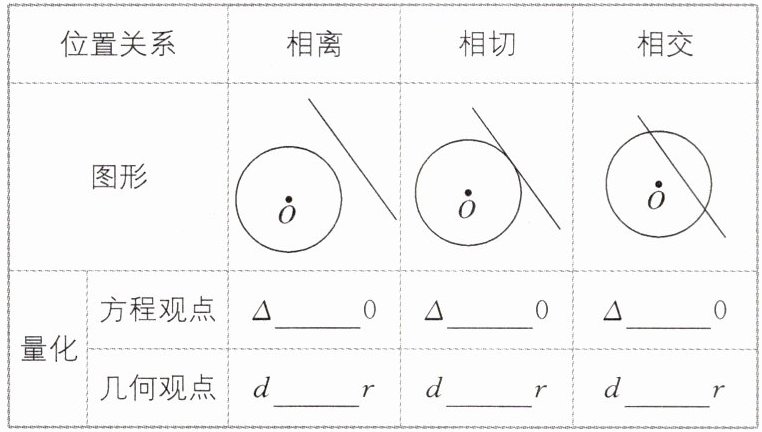 设圆 $ C:(x - a)^2 + (y - b)^2 = r^2 $,直线 $ l:Ax + By + C = 0 $,圆心 $ C(a,b) $ 到直线 $ l $ 的距离为 $ d $. 由 $ \begin{cases} (x - a)^2 + (y - b)^2 = r^2 \\ Ax + By + C = 0 \end{cases} $,消去 $ y $(或 $ x $),得到关于 $ x $(或 $ y $)的一元二次方程,其判别式为 $ \Delta $.