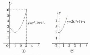 例2ACD[对于A,$y=x^2 - 2x + 3=(x - 1)^2 + 2$,由$x\in[0,3)$,再结合函数的图象(如图①所示),可得函数的值域为$[2,6)$.