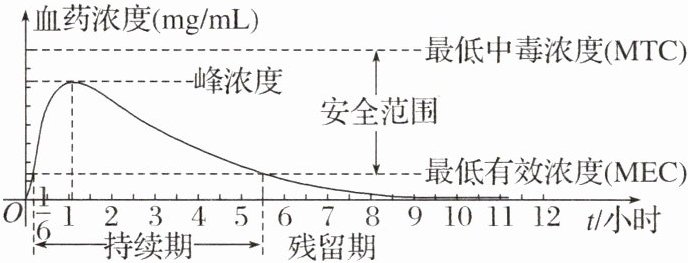 例1(多选)血药浓度是指药物吸收后在血浆内的总浓度. 药物在人体内发挥治疗作用时,该药物的血药浓度应介于最低有效浓度和最低中毒浓度之间. 已知成人单次服用1单位某药物后,体内血药浓度及相关信息如图所示: