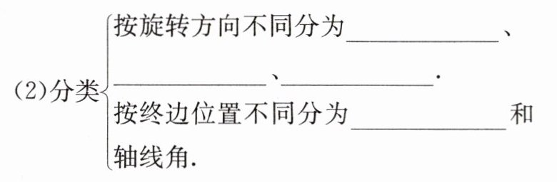 (3) 终边相同的角:所有与角$\alpha$终边相同的角,连同角$\alpha$在内,可构成一个集合$S=\{\beta|\beta=\alpha + k\cdot 360^{\circ},k\in \mathbf{Z}\}$.