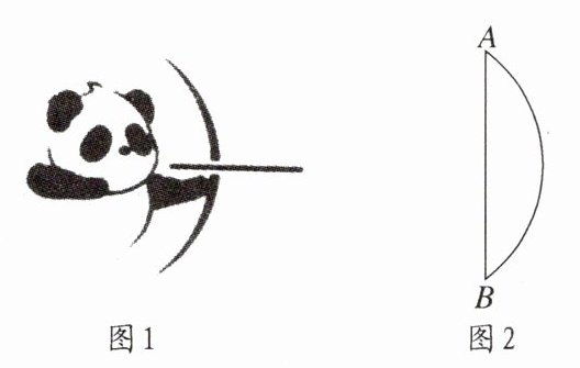 (2025·沈阳调研)成都大运会官方体育图标——“十八墨宝”以大熊猫“奇一”为原型,将中国体育与中国书画、中国国宝的融合做到了极致. 如图 1 所示,射箭的“水墨熊猫”以真实的射箭运动为原型,生动形象. 在如图 2 所示的弓形中,弧中点到弦中点的距离为$2\ cm$,弦长为$8\ cm$,则弓形的面积约为(参考数据:$\sin 74^{\circ}\approx 0.96,\pi\approx 3.14$)(