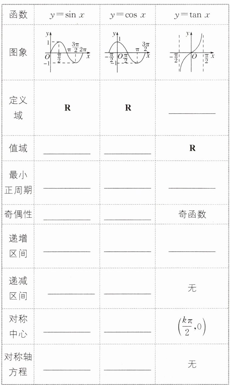2. 正弦、余弦、正切函数的图象与性质(下表中 $ k \in \mathbf{Z} $)