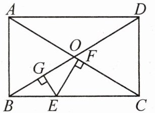 5. [2023·内江]出入相补原理是我国古代数学的重要成就之一,最早是由三国时期数学家刘徽创建.“将一个几何图形,任意切成多块小图形,几何图形的总面积保持不变,等于所分割成的小图形的面积之和”是该原理的重要内容之一.如图,在矩形ABCD中,$AB=5$,$AD=12$,对角线AC与BD交于点O,E为BC边上的一个动点,$EF⊥AC$,$EG⊥BD$,垂足分别为F,G,则$EF+EG=$