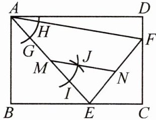 12. [2024·沈阳铁西期中]如图,在矩形 ABCD 中,$AB=8$,$BC=12$,点 F 在边 CD 上,且$CF=6$,点 E 是边 BC 上的一个动点,连接 AE,AF 和 EF,点 M 是线段 AE 的中点. 按照下面的步骤作图:①以点 A 为圆心,以任意长为半径作弧,交 AE 于点 G,交 AF 于点 H;②以点 M 为圆心,以 AG 长为半径作弧,交射线 ME 于点 I;③以点 I 为圆心,以 GH 长为半径作弧,交前弧于点 J,过点 M 作射线 MJ 交线段 EF 于点 N. 则在点 E 从点 B 运动到点 C 的过程中,线段 MN 扫过的图形的周长等于