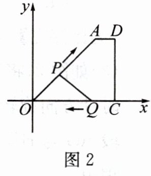 (2)如图 2,动点 P,Q 以 1 个单位长度每秒的速度分别从点 O 和点 C 同时出发,点 P 沿 OA,AD,DC 运动到点 C 停止,点 Q 沿 CO 运动到点 O 停止。设运动时间为 t s。是否存在某个时刻,使得△OPQ 为直角三角形?若存在,请求出 t 的值;若不存在,请说明理由。