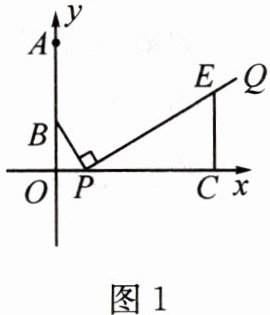 (1)如图 1,E 是射线 PQ 上一点,过点 E 作 EC⊥x 轴,垂足为 C。