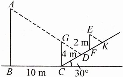 4. 小明想测量电线杆AB的高度,他发现某一时刻电线杆AB在太阳光下的影子正好落在坡面CD和地面BC上.已知CD和地面成30°角,CD=4m,BC=10m,且此时测得1m高的标杆在地面的影长为2m.