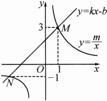 4. 如图,反比例函数$y=\frac {m}{x}$的图象与一次函数$y=kx-b$的图象交于点 M,N,已知点 M 的坐标为$(1,3)$,点 N 的纵坐标为 -1,根据图象信息回答下列问题: