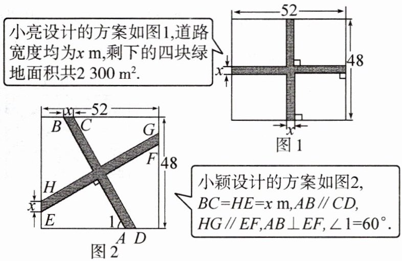 (2)求小颖设计方案中四块绿地的总面积(提示:小颖设计方案中的x与小亮设计方案中的x取值相同)。