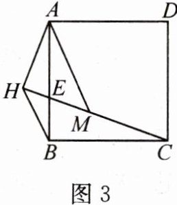 【拓展迁移】(3)小博深入研究小睿提出的这个问题,发现并提出新的探究点:如图 3,在正方形 $ABCD$ 中,$E$ 是边 $AB$ 上一点,$AH\perp CE$ 交 $CE$ 的延长线于点 $H$,点 $M$ 在 $CH$ 上,且 $AH = HM$,连接 $AM$,$BH$,可以用等式表示线段 $CM$,$BH$ 的数量关系,请你思考并说明理由。