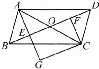 9. 如图,在 $□ ABCD$ 中,对角线 $AC$,$BD$ 相交于点 $O$,$E$,$F$ 分别为 $OB$,$OD$ 的中点,延长 $AE$ 至点 $G$,使 $EG = AE$,连接 $CG$。