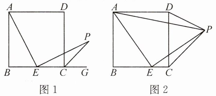 (2)如图 2,在正方形 $ABCD$ 中,$E$ 为 $BC$ 边上一动点(点 $E$,$B$ 不重合),$\triangle AEP$ 是等腰直角三角形,$\angle AEP = 90^{\circ}$,连接 $CP$,求 $\angle DCP$ 的度数。